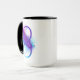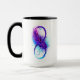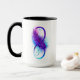 Símbolo do infinito com uma bela pena pintada em cores vibrantes roxas e azuis sobre um fundo branco.