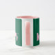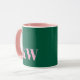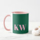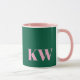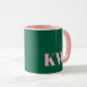 Esta caneca moderna apresenta suas iniciais em rosa em um fundo verde.