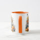 Uma caneca de café com aquarelas ilustrando um jardim de outono com abóboras em cores vibrantes de queda no primeiro plano, um porto cheio de flores de outono em cascata penduradas sobre uma cerca de cascata ligeiramente aberta no fundo e uma lanterna de ferro preto alto para mais charme. Tamanhos adicionais e cores da jante e da alça disponíveis.