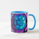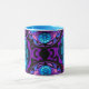 Esta caneca potente e surpreendente apresenta uma pintura digital original de crisântemos e tulipas altamente estilizados em tons vibrantes e legal de violeta e azul elétrico. O estilo foi inspirado no final do médio ao final do século XIX, "Movimento Artes e Artesanatos", que buscava celebrar o artífice individual como um protesto contra a produção em massa e a industrialização.