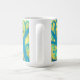 Mug com paisagem de conto de fadas, pássaros azuis sentados em árvores brancas. Pintura em Lã, amarela e turquesa © Clipso-Callipso / Julia Khoroshikh www.juliakhoroshikh.art #feltedlã #pintor de madeira #pássaros azuis