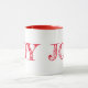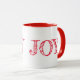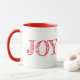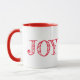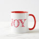 Esta caneca tem uma palavra vermelha de "JOY" sobre fundo branco.