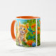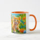 Um gatinho de mesa de laranja giro que franja num jardim floral com libélulas coloridas.