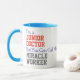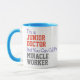 Mensagem divertida em uma caneca para um Doutor Júnior. Diz: "Pode me chamar de Milagre Trabalhador".