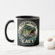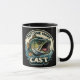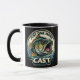 Largemouth bass jumping from water in a bold circular badge style with the phrase Just One More Cast. Clean composition with strong contrast and an aggressive bass for a classic outdoors fishing look.