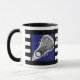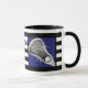 Caneca colecionável de lacrosse única, com arte em palitos de lax em fundo azul com listras pretas e brancas. Edite texto para adicionar o nome do seu jogador de lacrosse favorito, treinador ou fã de esportes de equipe.