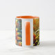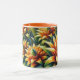 Caneca laranja com flores amarelas e verdes