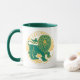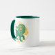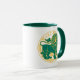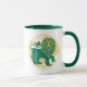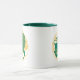 Leão do zodíaco em verde e amarelo numa caneca de café de duas tonalidades.