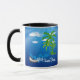 Três palmeiras verdes bonitos ao lado de um motivo azul arrebatador da onda e da flor de oceano. Nuvens brancas no céu, e "Miami Beach" no texto branco. Excelente para férias de florida, cumprimentos ou lembranças do viagem. Todo o © de Copyright do design www.CuteComfy.com 2012