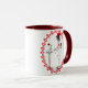 Desenho inspirado nos cartões antigos, uma jovem com aparência de A década de 1920 está vestindo um vestido de babydoll coberto de corações e arcos vermelhos enquanto ela perde seu correio de Dia de os namorados.