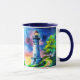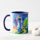 Mug in a watercolor style portrait of a lighthouse standing tall under a vibrant, star-filled night sky. Surrounded by lush green trees and soft grassy hills, its golden light glows warmly, creating an atmosphere that evokes wonder and tranquility.