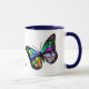 Aqui está uma caneca brilhante e colorida com uma linda e brilhante imagem de borboleta em cada lado. A imagem artística está em múltiplas cores: azul, verde, amarelo, rosa, laranja, preto e muito mais! Entre as duas imagens está seu texto personalizado em azul. Que lindo!