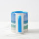 A linda caneca da casa de praia para um café da manhã à beira da praia, olhando para o oceano em sua casa de praia. Lindos céus azuis sobre lindas ondas verdes no litoral lavando sobre a areia branca macia. Eu amo a vida na ilha. Bonito material personalizado para tirar férias.