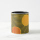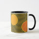 As listras pretas e amarelas e os círculos alaranjados e vermelhos decoram esta caneca atraente.