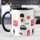 Mug com guardas bonitas de Londres, Coroa Real, Ônibus, bandeira do Reino Unido e outros símbolos de Londres. Personalize facilmente o texto ou deixe-o vazio. Kate Eden Art.