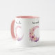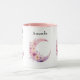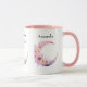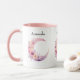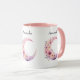 Uma caneca com uma bela ilustração com uma lua rosa e púrpura da lua. Bonito flores silvestres cor-de-rosa e amarelas adornam este corpo celeste.