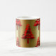 Uma elegante caneca de Natal, com um padrão decorativo de árvores de Natal vermelhas contra um fundo de ouro metálico para adicionar um toque de classe festiva à sua cozinha nesta temporada de festas.