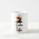 Uma imagem estilizada apresenta uma xícara de café transbordando de café, cercada por grãos de café, com as palavras "Calma e café" escritas abaixo dela.