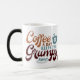 A funny and sarcastic retro-style graphic showcases a steaming cup of coffee bursting with energy. The vibrant text reads, "Coffee a day keeps the grumpy away." This playful design is featured on a variety of products, making it a perfect gift for coffee enthusiasts.