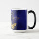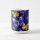 Composição de borboletas luxuosas de safira e joias de ouro em fundo azul texturizado.