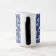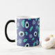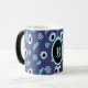 Caneca de café com formas geométricas e tons azuis e turquesas