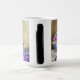 Magic Mug com um gatinho branco fofo! O gatinho de olhos azuis fica em uma tigela azul com flores cor-de-rosa. Um cobertor com flor púrpura é cortado na frente. Um presente maravilhoso para amantes de gatos e entusiastas de arte vitorianos!