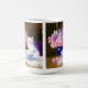 Magic Mug com um belo gatinho branco vestindo uma fita roxa! Este gatinho fluffy se posiciona próximo a uma tigela azul e um vaso de flores rosa, roxas e brancas. Um presente maravilhoso para amantes de gatos e entusiastas de arte vitorianos!