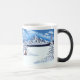 Uma caneca com uma bela cena de inverno, incluindo montanha, cabana rústica e vergreens depois de uma forte queda de neve. A imagem e o texto podem ser personalizados. Arte original por W.B.