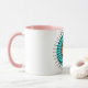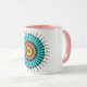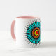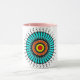 Uma bela caneca de cerâmica com um vibrante design de mandala turquesa e laranja. Este padrão circular intrincado traz uma sensação de paz e estilo artístico para sua bebida favorita."