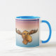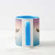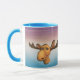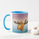 Falando na caneca do Moose com fundo azul e roxo do mar.