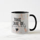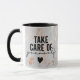 Uma caneca de ouro e cinza com as palavras: Cuide-se.