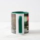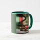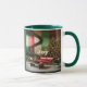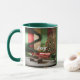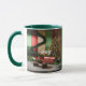 This mug has a green handle and interior. The mug has a MidCentury Modern art style living room with shiny metallic red and metallic green furniture. The word Joy is in silver letters on both sides of the mug. The mug is microwave and dishwasher safe The mug is made with strong, ceramic construction. The coffee mug meets the FDA requirements for food and beverage safety. The mug shown is an eleven ounce combo mug.