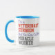 Mensagem divertida em uma caneca para um veterinário cirurgião. Diz: "Pode me chamar de Milagre Trabalhador".