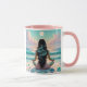 Linda arte ai retratando uma linda mulher meditando na praia com pina e nuvens azuis, ondas oceânicas, areia branca e vidro marinho.