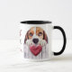 "A melhor mãe do cão" declara esta caneca fofa no centro. A imagem em cada lado é de um adorável Beagle espreitando sobre uma cerca de madeira e oferecendo um coração vermelho brilhante. Perfeito para Dia de as mães ou aniversário dela! Todo o texto é personalizável, então você também pode alterá-lo para Pai no Dia de os pais.