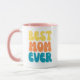 Uma caneca de café que diz "Melhor Mãe Nunca" em amarelo, laranja e azul.
