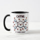 Uma ilustração lúdica de uma molécula de cafeína com um smiley face. A molécula é cercada por pequenos grãos de café dançando ao seu redor, enfatizando a alegria que a cafeína traz. Perfeito para amantes do café que apreciam um toque de ciência e humor em seu seio diário.