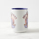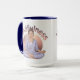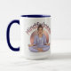 This mug features digital illustration of a woman meditating in a lotus position before a large rose gold circular background. The woman wears a lavender wrap-style robe over a white top, with her hair styled in a neat bun. Her eyes are closed in a peaceful expression and her hands are positioned in meditation mudras on her knees. The word Mindfulness appears in large, curved text at the top of the image, in a rose gold gradient. The mug is a navy blue and white combo mug. The mug has a navy blue glaze interior and a navy blue handle. The mug is a fifteen ounce mug.