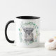 "AMA MEU ESQUINHO" declara esta caneca para o dono do Cachorro Schnauzer em miniatura. Cada lado da caneca tem um belo retrato aquoso de uma cinza azul Schnauzer em uma coroa azul verde. Entre as duas imagens está o texto, que pode ser facilmente personalizado, ou mesmo removido, por você.