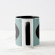 Esta caneca de dois tons tem uma alça preta e um interior preto. O fundo Dusty Aqua sobre a caneca branca apresenta ovais em cada lado com uma coroa verde aqua no centro das ovais bordadas por cinzas. Texto personalizado por baixo de cada coroa para personalização. Exemplo de texto mostrado em "Miss Montana". Personalize este item ou comprar conforme mostrado.
