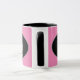 Esta caneca de dois tons tem uma alça preta e um interior preto. O fundo cor-de-rosa sobre a caneca branca apresenta ovais em cada lado com uma coroa de rosa claro no centro das ovais limítrofes por cinzas. Texto personalizado por baixo de cada coroa para personalização. Exemplo de texto mostrado em "Miss Montana". Personalize este item ou comprar conforme mostrado.