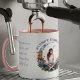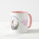 Una hermosa taza con ilustración en acuarela: una mujer meditando bajo una luna rodeada de flores silvestres, con la frase: "En el silencio del ser, sonrió con paz".