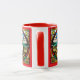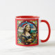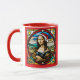 A funny Christmas mug featuring the Mona Lisa wearing a Santa hat portrayed in stained glass.