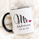 Mantas de café personalizadas para o recém-casado Sr. e Sra. apresentam um roteiro preto elegante e um texto monograma personalizado de sobrenome e data de casamento que pode ser personalizado. Design inclui um detalhe de coração vermelho fofo. Faz um presente de casamento excelente! Compre nossa loja para a design de caneca coordenadora.