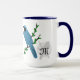 Turquesa Jay parado em um galho de árvore. O pássaro mascarado atrás está olhando para a esquerda. Na parte inferior direita da ave está uma marca d'água do pássaro bonito, com a letra M, o m é pequeno para monograma e pode ser mudado.