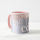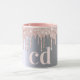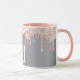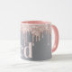 Uma caneca elegante, feminina e de vidro. Rosa dourado e cor-de-rosa, pingado, pintura pingando. Fundo metálico de aparência fina prateada. Personalize e adicione suas iniciais, letras do monograma. Letras rosa douradas.