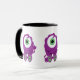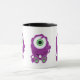 Monstro de ciclistas adorável com um olho grande parcialmente coberto por uma cortina perdida e com um dente grande no Halloween roxo e esmailes verdes e waves olá. Um presente agradável e festivo.