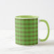 Uma Mug Chic White Coffee, com um lábio verde e uma alça e um padrão Check Gingham com aparência de casa em dois tons de verde que se coordenam com a Coleção 'Poppy Fields' de Posh & Painterly de Judy Adamson.
