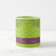 Caneca personalizável com aglomerado de uvas roxas frescas com gotas de água sobre fundo verde com padrão de folhas de vinha e espaço para seu texto.