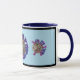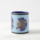 Família de peixes com barbatanas roxas. Cuidado com peixes hippies livres com flores em corpos e barbatanas de fios roxos. Olhos grandes e bocas sorridentes. Grande peixe "papa" leva "mamã" e "bebê" ao redor da caneca. fundo azul claro com um quadro preto ao redor de toda a imagem. Trabalho de arte original de cerâmica por Nora Chen. O texto abaixo diz "Peixe de Fios de Rico" (Pode ser personalizado).